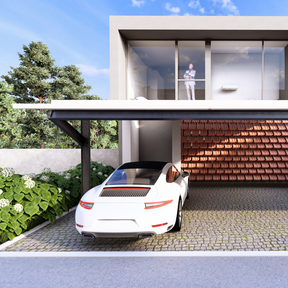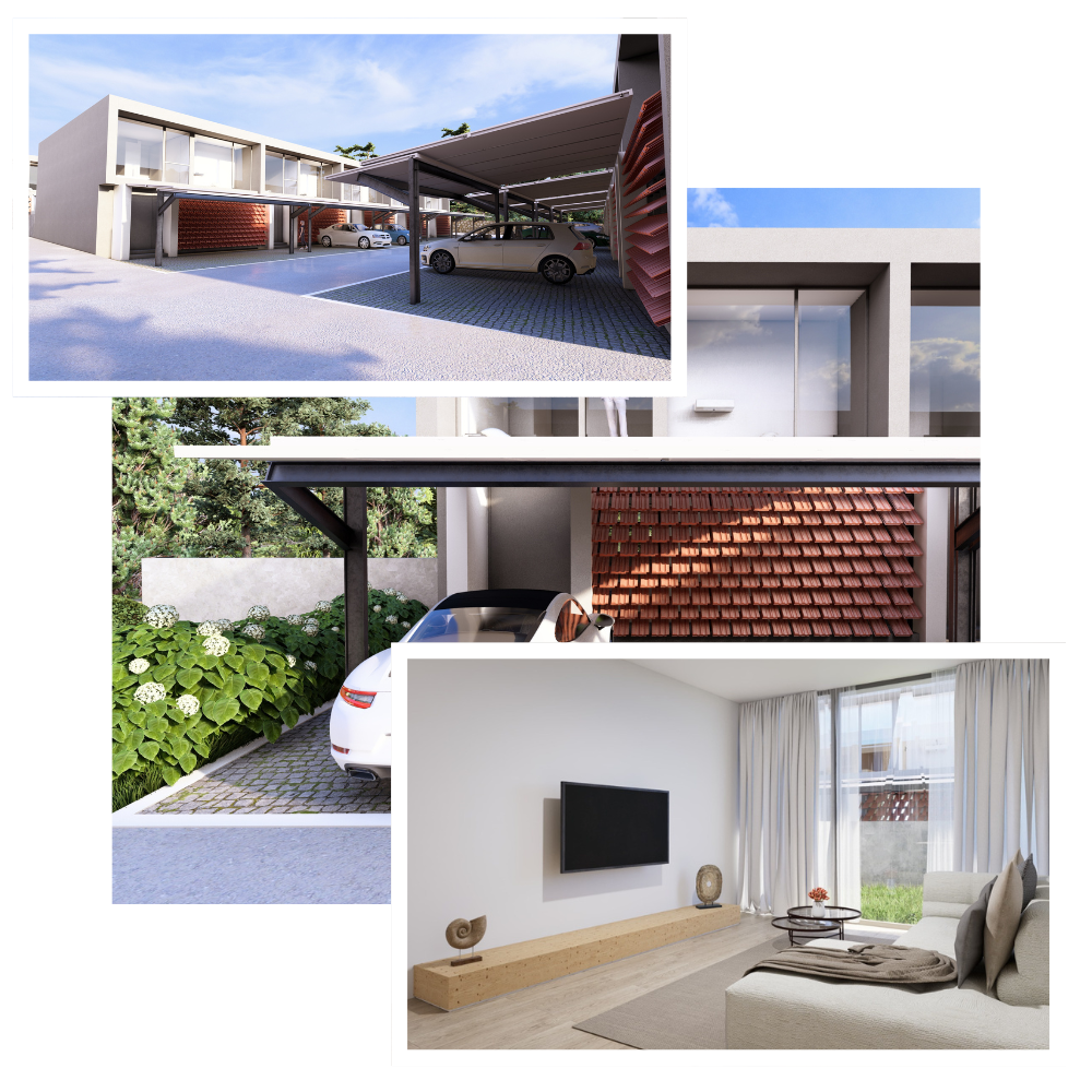 As moradias de 2 pisos são orientadas a Nascente/Poente, proporcionando a melhor eficiência energética oferecida pelo contexto arquitetónico projetado para maximizar a luz natural e o mínimo de manutenção. Cada fração possui dois lugares privativos de estacionamento carral sob pérgola, adaptando-se às necessidades dos utilizadores.